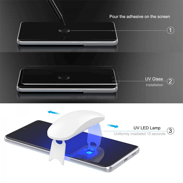 - Pachetul UV Full Glue contine: Folie sticla curbata UV Full Glue, Adeziv UV, Lampa UV, Servetel de curatare, Sticker pentru indepartarea impuritatilo